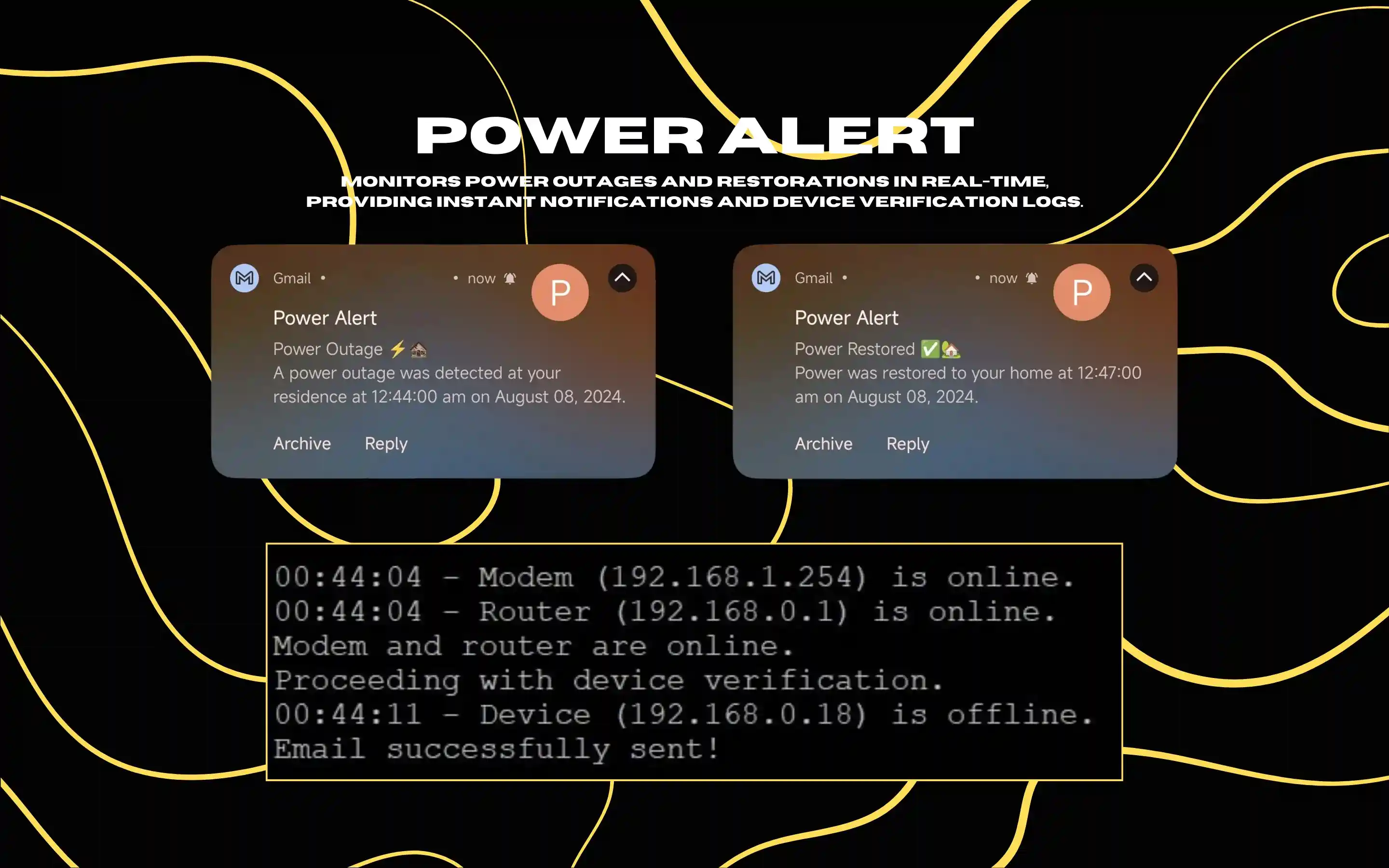Power Alert is a Python script that detects power outages and restorations by pinging device IPs. If no response is received, it triggers real-time email alerts, ensuring users are promptly informed about power status changes.