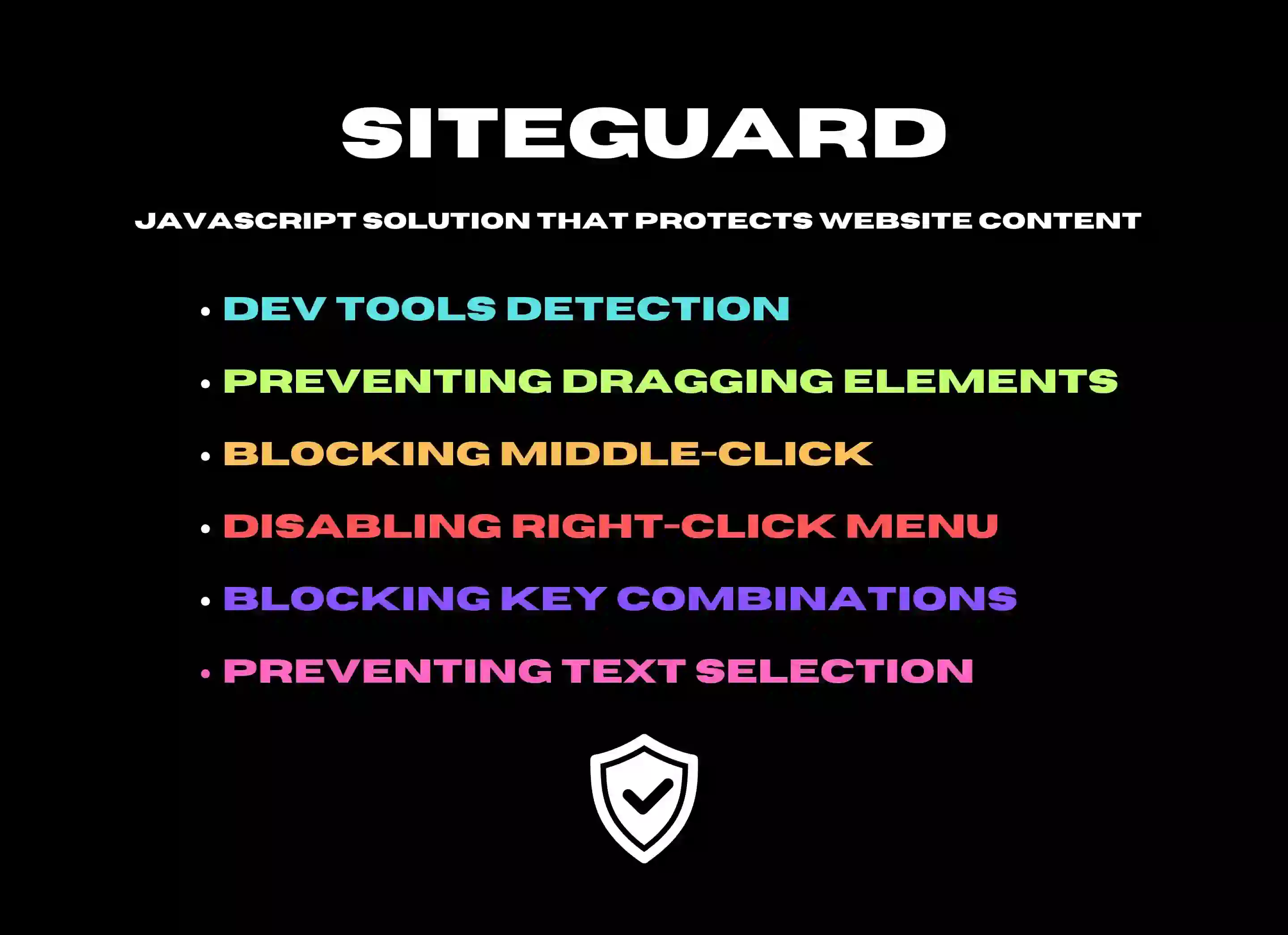 SiteGuard is a JavaScript-based solution to enhance website security by blocking unauthorized access to developer tools. It also restricts actions like right-clicks, drag events, and specific keyboard shortcuts, ensuring website content is protected against unauthorized actions.